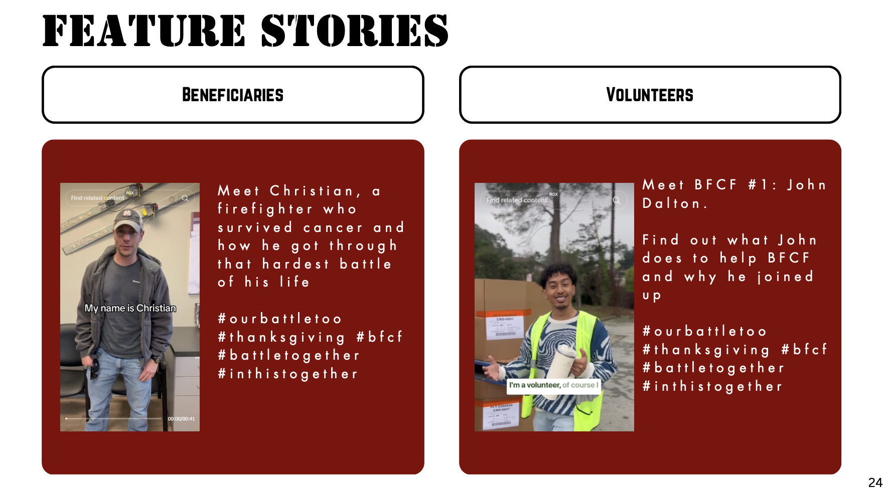 Standardize the look of all social media platformsReel and highlight coversIdentical fonts, colors, and themes for graphicsSchedule posts for consistencyUse a consistent hashtag on all posts (#OurBattleToo)Rename social media to @bfcf or @bfcfundThe Socials